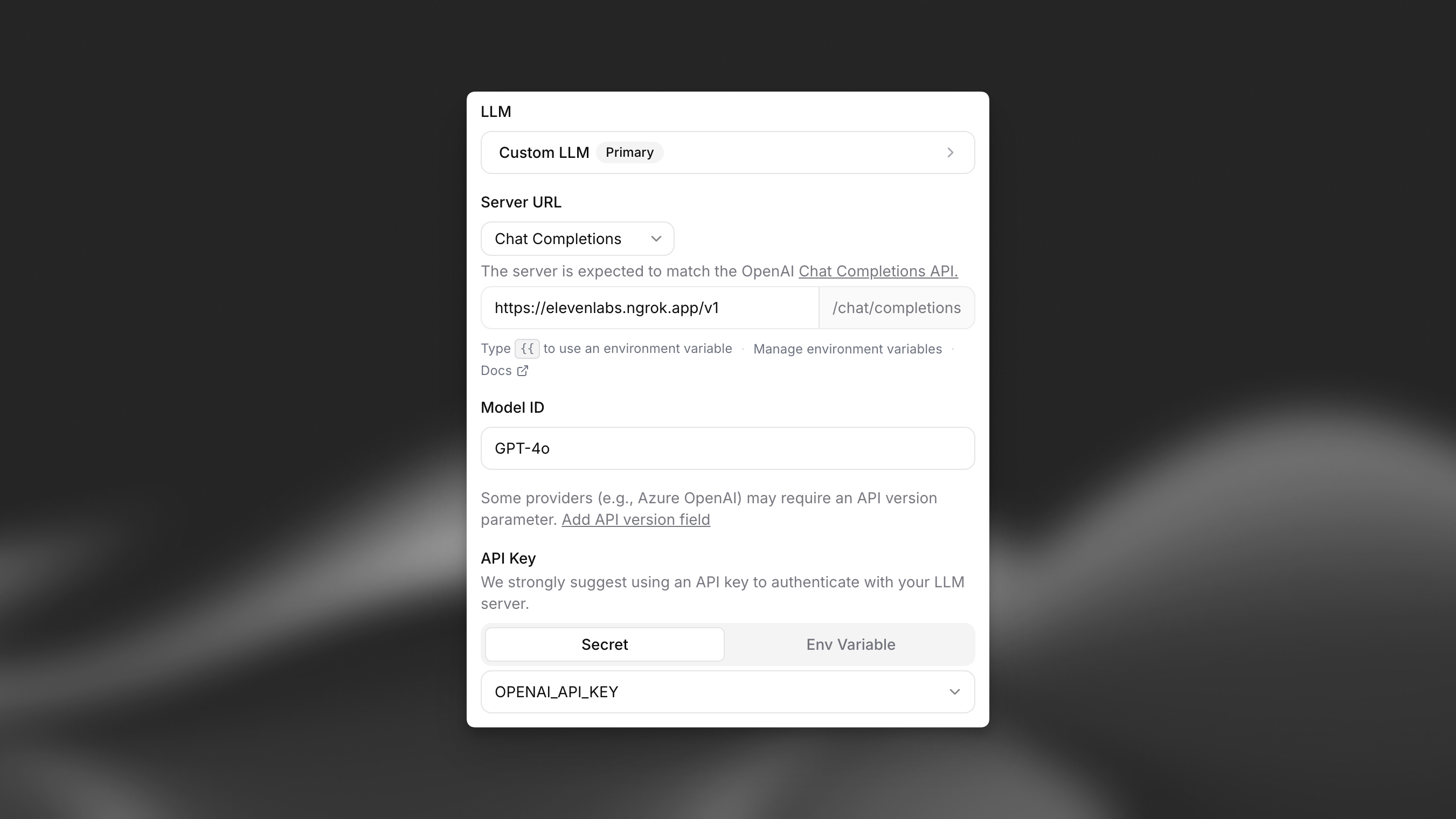 Next, update your agent settings in the ElevenLabs dashboard to point to your custom LLM server.